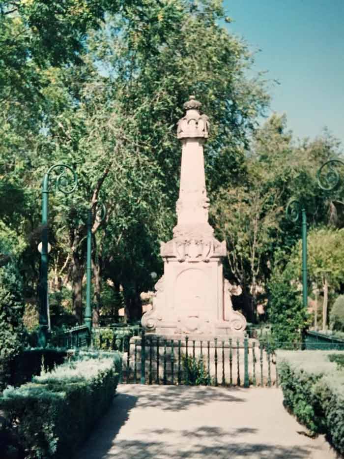 El Monumento del VII Centenario de la Aparición de la Virgen de la Cabeza en su emplazamiento original en los jardines laterales de la Parroquia de San Miguel, hoy plaza del Beato Marcos Criado.