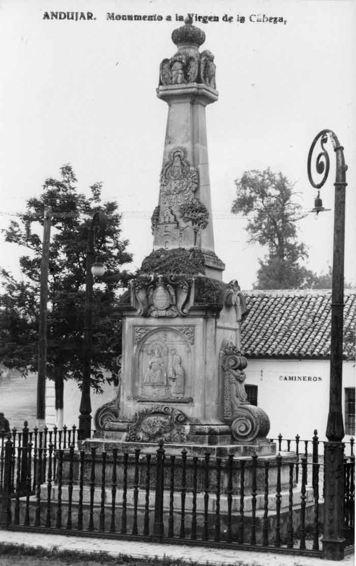 «ESTE MONUMENTO FUE COSTEADO POR DEVOTOS DE LA SANTISIMA VIRGEN DE LA CABEZA COMO RECUERDO DE LAS GRANDIOSAS FIESTAS CELEBRADAS EN EL VII CENTENARIO DE SU APARICIÓN EN SIERRA MORENA. AÑO MCMXXVII».