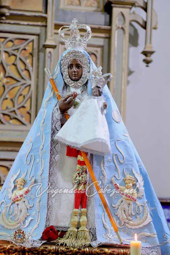En las fotos de arriba la imagen está vestida recuperando la estética clásica del siglo XVII y tradicional de la Virgen que podemos ver en antiguos cuadros. Como el cuadro de la Virgen de la Cabeza de Colomera que está a la izquierda del altar mayor de la parroquia de la Encarnación de Colomera, cuadro fechado en el último tercio del siglo XVII.