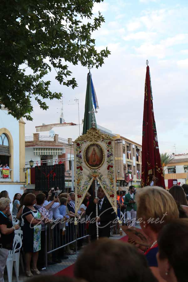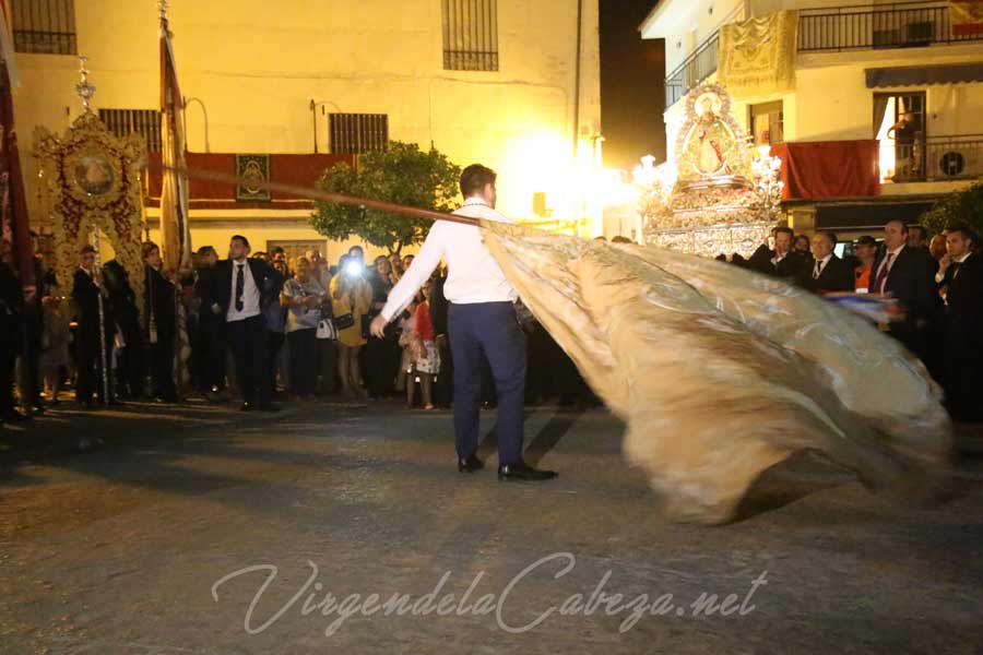 El estandarte de la Cofradía Matriz junto a sus banderas encabezó el caminar de la imagen por las calles de El Carpio siendo las únicas insignias que acompañaron a la imagen.
