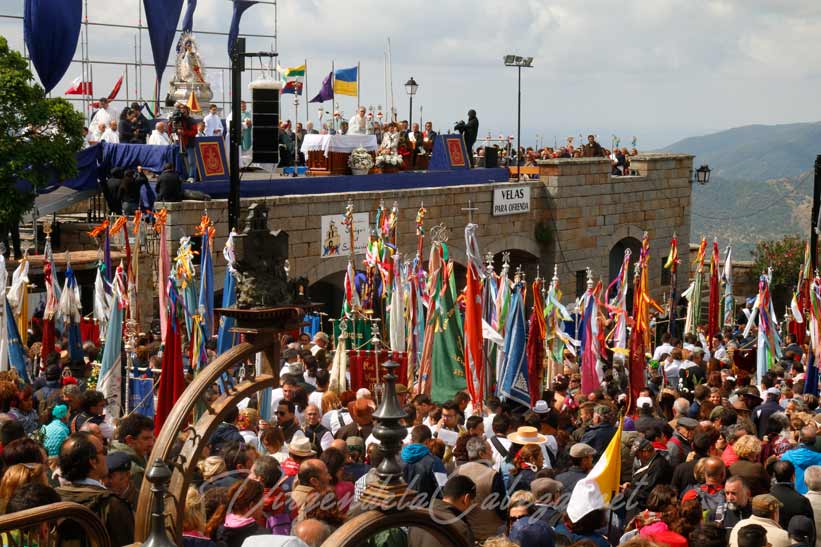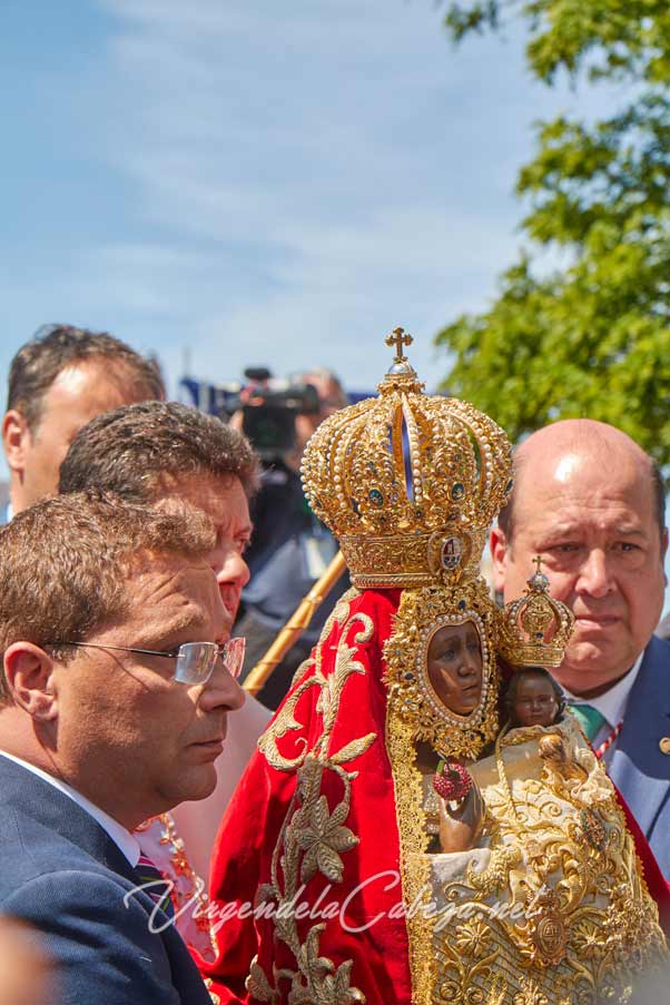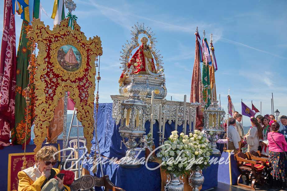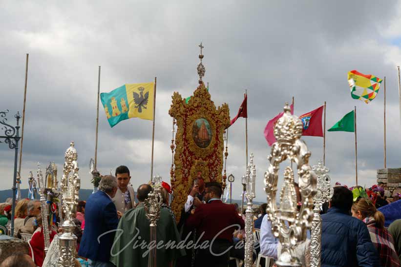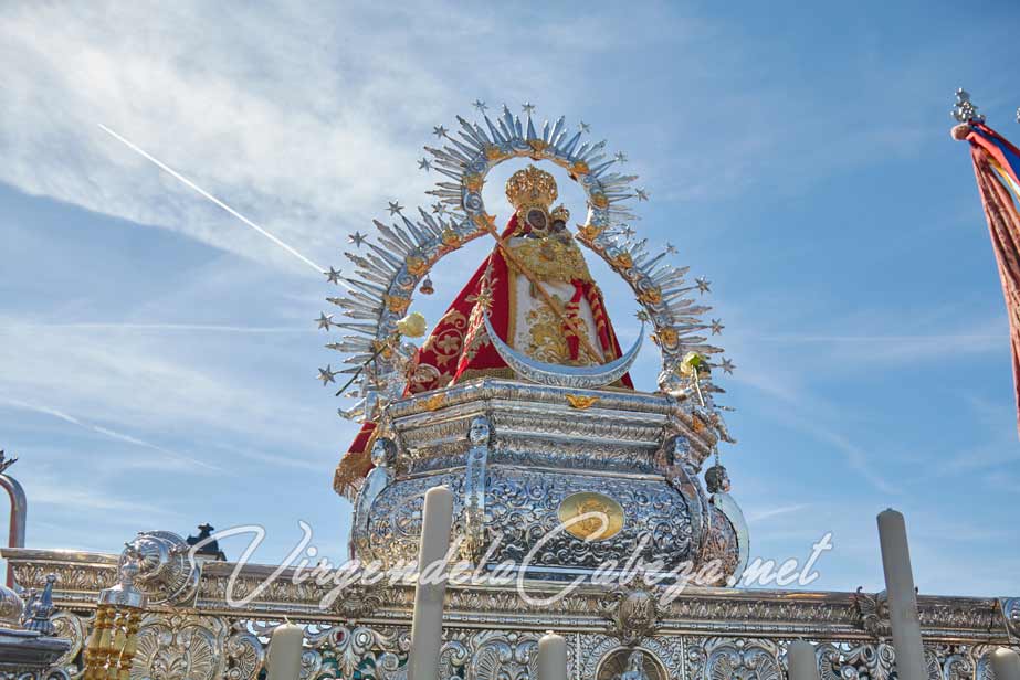 Virgen de la Cabeza en sus andas procesionales a su paso por la plaza en el poblado del santuario.