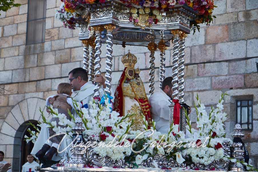 Dos trinitarios, a uno y otro lado de la Imagen, van tomando objetos para ser pasados por el manto. Los niños igualmente son elevados hasta las andas para ser bendecidos por la Santísima Virgen. A su vuelta y una vez en el templo se repiten las mismas escenas que al principio, la Virgen vuelve a su camarín y ya alguno piensa en el año que viene.
